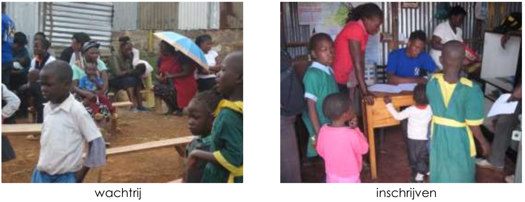 De volgende morgen meteen aan de gang. We moeten even onze draai vinden, maar al gauw loopt de carrousel lekker door. Ook de Keniase medewerkers van de Sophia Foundation, David, Nelson, Hesbon, Benson, Myriam en Erasmus, voegen zich in de carrousel. We “doen” de St. Clementschool, voor MCC een bekende locatie. Dat is ook wel te merken, we zien er veel goed groeiende, happy kinderen. De teachers helpen met vertalen, maar ook heel wat kinderen spreken goed Engels.