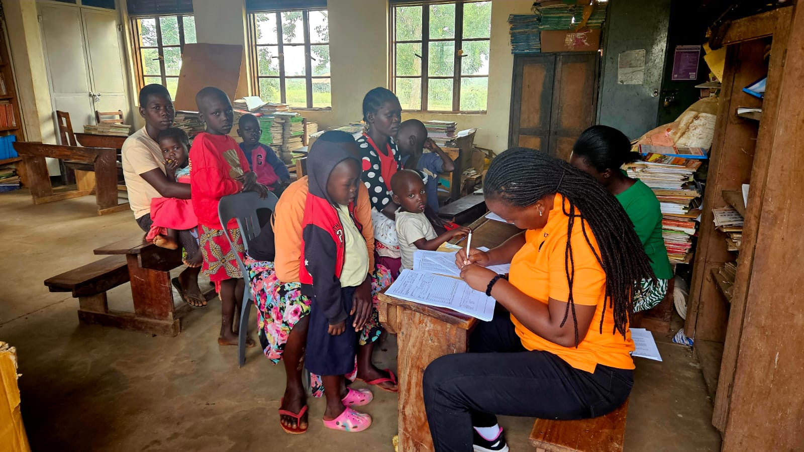 We beginnen de dag met het inrichten en klaarzetten van de stations (zie verderop). De kleine klaslokalen, gevuld met schoolbankjes en zelfgemaake posters met werkwoorden in de lokale taal (Luganda), worden omgetoverd tot screening stations. Op het terrein staan tenten voor de dokterspost en apotheek.
